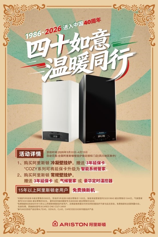 值此入华四十周年之际,阿里斯顿以品质为基、福利为礼,特别发起“四十如意,温暖同行”主题促销活动,与广大新老用户共赴温暖之约。即日起至2026年4月15日,凡进店选购阿里斯顿冷凝壁挂炉,即可免费获赠3年延保卡,其中明星款COZY系列可将延保卡升级为“智能系统管家”,为用户提供智能、便捷、高效的家居温度管理体验;购买常规壁挂炉,可在3年延保卡、气候管家、豪华定时温控器等多款实用好礼中任选一款;针对使用年限满15年及以上的老用户,品牌特别推出专属尊享特权——有机会免费换新机,用暖心福利回馈万千中国用户长久以来的信赖与陪伴。